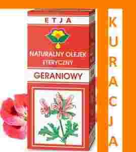 Olejek posiada właściwości przeciwbakteryjne i przeciwwirusowe. Reguluje gospodarkę hormonalną organizmu. Przeciwdziała zatrzymaniu płynów, a działając stymulacyjno na system odpornościowy, jest podwójnie skuteczny w zwalczaniu cellulitu. Działa uspokajająco i tonizująco na system nerwowy, dodaje energii oraz łagodzi bóle głowy. Olejek geraniowy często wykorzystywany jest przy leczeniu opryszczki tzw. zimno oraz przy infekcjach grzybiczych. Odstrasza owady oraz działa antynikotynowo.