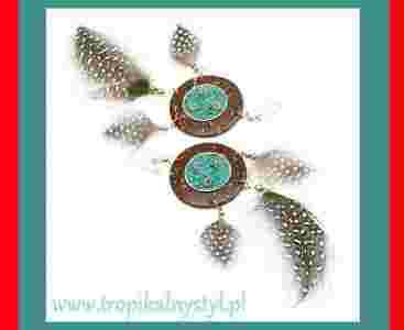 Ręcznie robione kolczyki z ozdabianego kokosa, piór, chryzokoli i metalu alpaka. Te etniczne kolczyki stworzył z dbałością o szczegóły peruwiański artysta. Z łupiny kokosa wycięto oryginalne formy. W centrum kolczyka znajduje się rozdrobniony kamień chryzokola. Te niesamowite kolczyki dodadzą uroku każdej kobiecie. Zawieszki kolczyków zostały wykonane z materiału zwanego alpaka. Jest to nie uczulający stop metali, stosowany w jubilerstwie.