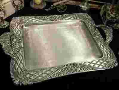 Zapraszam do licytacji zjawiskowo pięknej tacy.Fantastyczny wzór, wspaniałe, ergonomiczne uchwyty.Taca jest stosunkowo lekka , choć z drugiej strony bardzo sztywna i stabilna.A wszystko bardzo plastyczne w kolorze polerowanej cyny .Przedmiot cynowany,.ładna rzecz, zapraszam