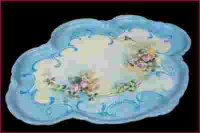 Śnieżnobiała porcelana na której umieszczono wspaniałą malaturę w motyw girland pastelowych róż na tle fantazyjnych gałązek i liści - całość na tęczowym, cieniowanym tle - wspaniała, bogata paleta barw. Wokół zachwycającej, pastelowej malatury znajduje się szeroki błękitny szlak z podkreślonymi białą emalią rokailami.