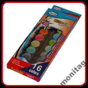 Przedmiotem aukcji jest zestaw 16 podstawowych kolorów farb akwarelowych zamkniętych w lekkim plastikowym opakowaniu. Farby mają nasycone kolory i są bardzo wydajne. Kolory farbek dostępne w zestawie: czarny, biały, beżowy, brązowy, pomarańczowy, błękitny, fioletowy, granatowy, czerwony, żółty, jasno zielony, ciemno zielony.