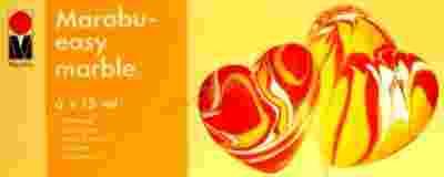 Za pomocą farb Easy Marble firmy Marabu możemy stworzyć marmurkowy wzór na różnych powierzchniach. Idealnie sprawdzają się na plastikowych jajkach, szklanych bombkach, obiektach szklanych i plastikowych, metalu, papierze,świeczkach. Czas schnięcia farby wynosi ok 15 min. Wzór po namalowaniu nie jest wodoodporny, możemy go dodatkowo zabezpieczyć lakierem.