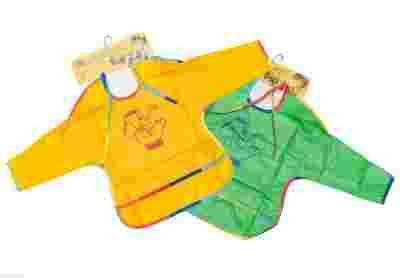 Fartuszek wykonany jest z nieprzemakalnej folii. Posiada rękawki, które skutecznie ochronią ubranko dziecka przed zabrudzeniem. Śliniak wyposażony jest w kieszonkę, zatrzymującą resztki spadającego pokarmu. Kieszonka może posłużyć jako przybornik na kredki, flamastry, farby itp. podczas prac plastycznych. Po skończonym jedzeniu lub zabawie, śliniak wystarczy przetrzeć wilgotną ściereczką. Fartuszek wiązany jest na szyi troczkami. Fartuszek ma wesołe i miłe dla oka dziecka kolory.