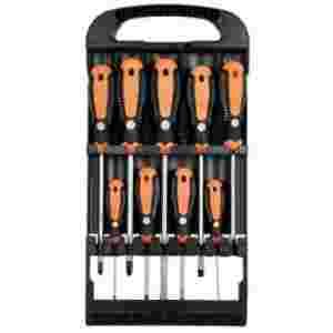 Zestaw wkrętaków z materiału CR-V zapewniającego większą wytrzymałość i mniejsze zużycie. Zestaw składa się z pięciu wkrętaków płaskich i czterech krzyżakowych. Rozmiary wkrętaków zostały wybrane tak, aby odpowiadały wkrętom wykorzystywanym w każdym domu. W zestawie znajduje się również uchwyt na ścianę, który można przymocować do ściany czy do drzwiczek szafki narzędziowej.