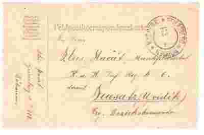 FELDPOSTKORRESPODENZKARTE 1914r. jak na skanie, Treść korespondencji na rewersie. UWAGA: ZE WZGLĘDU NA PODESZŁY WIEK I INWALIDZKI STAN ZDROWIA (I Gr. Inwalidzka) WYPRZEDAJĘ NA ALLEGRO SWOJE RODZINNE ZBIORY KOLEKCJONERSKIE, KTÓRE GROMADZIŁEM PRZEZ OKOŁO 60 LAT: 1) FILATELISTYKA W SZEROKIM ZAKRESIE RODZAJOWYM I TEMATYCZNYM (znaczki, FDC, karty pocztowe, revenue, spec. ostemplowania, koperty z obiegu pocztowego i inne) 2) RÓŻNEGO RODZAJU STARE DOKUMENTY: SĄDOWE, NOTARIALNE, PARAFIALNE, GMINNE, MAGISTRACKIE, FIRMOWE (listy i pisma), LEGITYMACJE, DOWODY OSOBISTE, PASZPORTY, KARTKI ŻYWNOŚCIOWE, WIDOKÓWKI, ZDJĘCIA, AKCJE, OBLIGACJE, POLISY, STARE BANKNOTY I INNE. PRAWIE CODZIENNIE DOSTAWIAM W ALLEGRO KOLEJNE WALORY KOLEKCJONERSKIE na loginach: BEZ1 i majela06 PRZY ZAKUPIE WALORÓW W KILKU AUKCJACH- WYSYŁKA WSPÓLNA ZA JEDNYM KOSZTEM PORTO. Wysyłki listem zwykłym niepoleconym na ryzyko KUPUJĄCEGO. Przesyłki krajowe o zawartości do 110zł list polecony, natomiast o zawartości powyżej 110 zł do uzgodnienia np. list wartościowy. Przesyłki zagraniczne wysokość porto do uzgodnienia. ZA ZAKUPIONE PRZEDMIOTY PROSZĘ WPŁACAĆ BEZPOŚREDNIO NA MOJE KONTO BANKOWE PODANE W ALLEGRO BEZ POŚREDNICTWA PayU. BĘDZIE PEWNIEJ I SZYBCIEJ. Posiadam też konto bankowe PayPal.