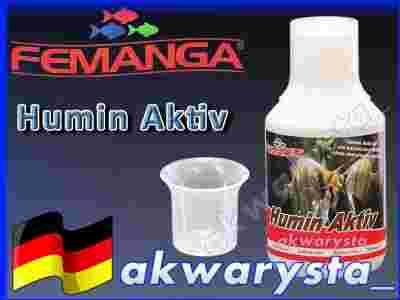 FEMANGA Humin Aktiv to silny koncentrat substancji humusowych o właściwościach leczniczych. Jest to naturalny wyciąg ciemnego koloru, nie chemiczny środek zmieniający się pod wpływem światła. Ma korzystny wpływ na leczenie chorób zakaźnych, ogranicza rozprzestrzenianie się bakterii patogennych, w naturalny sposób przyspiesza gojenie się ran, wzmacnia system immunologiczny, wspiera regeneracje błony śluzowej. Środek ten ma wpływ na metabolizm, substancje humusowe są w stanie zmieniać enzymy, pozytywnie wpływają na biologię wody i zwierząt. Stwierdzono również pozytywny wpływ na podchodzenie ryb do tarła. Już po 2-5 dniach stosowania widoczne jest uwolnienie skrzeli skóry od pasożytów (Trichodina, Apiostoma, Trichodinella).