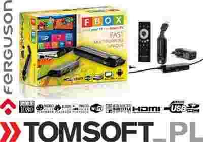 Ferguson FBOX to mini komputer oparty o szybki dwurdzeniowy procesor i wydajną grafikę 3D. Jest to rozwiązanie z bezprzewodowym żyroskopowym pilotem oferujące Smart TV do każdego telewizora. Urządzenie dedykowane jest do obsługi multimediów zarówno z pamięci przenośnych jak i strumieniowanych bezpośrednio z sieci Internet. Posiada, unikalne w tej klasie, sprzętowe wsparcie XBMC do dekodowania materiałów w wysokiej rozdzielczości HD 1080p. System Android pozwala na głęboką wielozadaniowość tj. obsługę internetu, filmy, gry, muzykę, radio internetowe i wiele wiele więcej. Dodatkowo w zestawie znajdziemy unikalny HUB z dwoma portami USB, czytnikiem SD i modułem sieci bezprzewodowej WiFi. Całość wspiera 2 Amperowy zasilacz pozwalający na bezproblemową obsługę dysków bez własnego zasilania. Elastyczna końcówka HDMI pozwala na wpięcie urządzenia pod dowolnym kątem do telewizora.