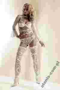Przód oraz boczki wykonane z białej koronki z efektownym haftem - kwiaty i kokardki. Ozdobione dwiema małymi kokardkami bo bokach.