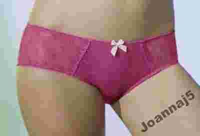 Figi wykonane z koronkowego tiulu w kolorze różowym. Przód zdobi kremowa kokardka.