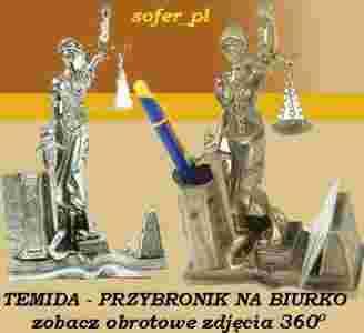 Figurka Temidy spełnia również funkcję przybornika na biurko: posiada pojemnik na długopisy oraz miejsce na wizytówki lub karteczki (wizytownik).