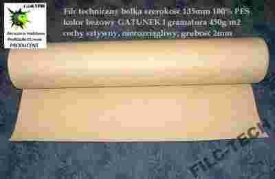 Filc beżowy (drewnopodobny) techniczny wykonany z wysokiej jakości włókniny poliestrowej 100%, produkowany w polskich zakładach włókienniczych. Grubość filcu 2mm, wysoka gramatura ok.450g/m2. Zastosowanie głównie w przemyśle meblarskim, motoryzacyjnym, technika, etc.... Towar, który Państwu oferujemy jest niedostępny w ogólnodostępnej sprzedaży na terenie naszego kraju- jest produkowany wyłącznie na zamówienie dla naszej firmy- zgodnie z naszą własną recepturą i naszymi oczekiwaniami co do parametrów technicznych. Filc od wewnętrznej strony został utwardzony termicznie dwoma warstwami (jest zupełnie gładki) przez co jest sztywny i całkowicie nierozciągliwy. Zewnętrzna strona - piękna struktura beżowego filcu (patrz zdjęcie).