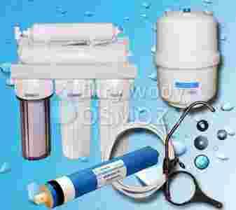 System filtracyjny odwróconej osmozy RO5, zestaw na polskiej linii produktów. W zestawie znajduje się pojedyncza wylewka oraz zbiornik 6-7 l. W skład oferowanego systemu filtracyjnego wchodzą: