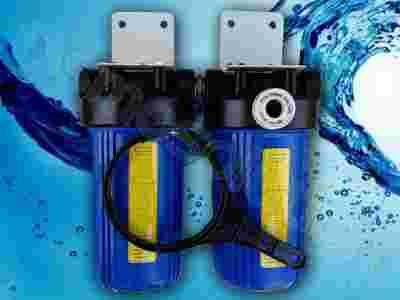 2 korpusy Big Blue połączone ze sobą nyplem z gotowymi płytkami montażowymi. Ponadto do wyboru są 2 zestawy z różnymi specjalistyczymi wkładami filtrującymi.