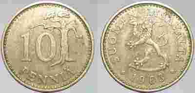 FINLANDIA - 10 PENNIA 1963 r MONETA NR 2