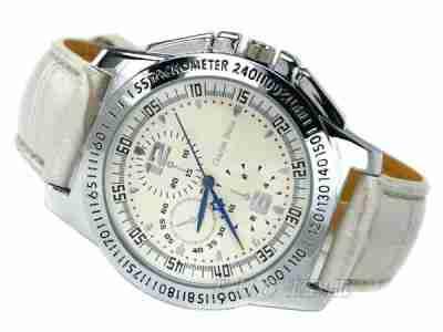 Zegarek unisex z paskiem.Koperta metalowa znal kolor srebrny polerowana.Tarcza kolor kremowy,sygnowana logiem producenta.Wskazówki kolor niebieski.Szkiełko mineralne odporne na zarysowania.Pasek standard kolor beż/ekri.Zapinka metalowa srebrna,sygnowana logiem producenta.3 tarczki po środku to imitacja chronograph