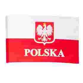 FLAGA POLSKI 136x68 (godło i napis)