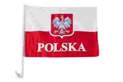 FLAGA SAMOCHODOWA Z GODŁEM POLSKI FLAGA POLSKI