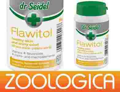 Flawitol zdrowa skóra i piękna sierść - zapewnia prawidłowy stan skóry, dzięki zawartości cynku, biotyny, kwasu pantotenowego oraz witamin A i E wspomaga proces regeneracji skóry, zapobiega jej wysuszaniu i łuszczeniu się. Dodatek flawonoidów w preparacie zwiększa odporność organizmu na wiele chorób (w tym nowotworowych) i opóźnia procesy starzenia. Zapobiega wysuszeniu i nadmiernemu łuszczeniu się skóry. Daje piękną, błyszczącą sierść.