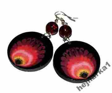 Kolczyki z drewnianych kółek zdobionych dwustronnie techniką decoupage.