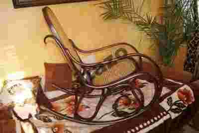 Piękny klasyczny fotel bujany, wykonany z giętego drewna. Mebel wyjątkowy, gdzie siedzisko i oparcie zostało wykonane z rafii, co czyni go bardzo eleganckim i jedynym w swoim rodzaju.