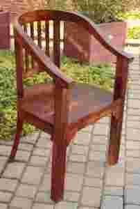 Elegancki fotel gabinetowy z półokrągłym, wysokim oparciem, wykonany z drewna sezamowego w kolorze ciepłego miodowego brązu. Na oparcie, które sięga aż do łokci, składa się rząd kilku szczebelków średniej długości. Odpowiednie wyprofilowanie oraz gruba płyta siedzeniowa, zapewniają stabilizację i wygodę użytkowania. Rozwiązania te oraz surowiec, którego użyto do wyrobu krzesła gwarantuje solidność i trwałość mebla, a prosta forma fotela sprawia, że będzie on idealnie pasował do każdego wnętrza.