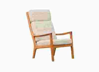 Oryginalny duński fotel projektu Ole Wanschera z 1951 roku,  model „senator” w wersji z wysokim oparciem. Konstrukcja drewna tekowego, odświeżona, stabilna bez uszkodzeń. Oryginalna wełniana tapicerka, ślad na siedzisku po zaszyciu materiału – pokazane na ostatnich zdjęciach. Produkcja P JEPPESEN.
