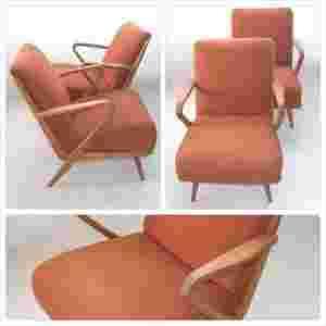 Stolarka meblowa poddana całkowitej renowacji. Stary i nieestetyczny lakier nitro zastąpiliśmy miękkim woskiem i olejem meblarskim. Obicie oryginalne w kolorze rudym, zachowane w stanie dobrym/ bardzo dobrym (kilka obtarć oraz delikatne wyblaknięcie materiału na całości).