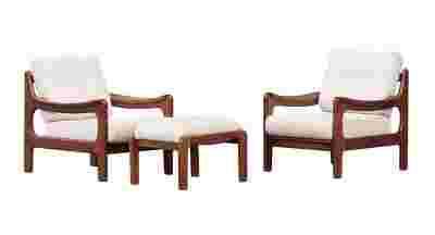 Wygodne fotele z podnóżkiem w stylu duńskiego modernizmu. Konstrukcja o organicznej formie z masywnego drewna orzechowego w bardzo dobrym stanie. Oryginalna tapicerka wełniana bez uszkodzeń, do wyprania.
