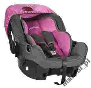 Fotelik samochodowy przeznaczony od urodzenia do osiągnięcia wagi ok 13 kg (grupa 0+). Montaż za pomocą 3 punktowych zintegrowanych pasów samochodowych. Możliwość montażu zarówno w tylnej i jak i przedniej części pojazdu (po wyłączeniu poduszki powiepowietrznej), zawsze tyłem do kierunku jazdy z uchwytem w pozycji pionowej. Dzięki wygodnej rączce możemy wykorzystać fotelik jako nosidełko podczas szybkich zakupów lub wizyty u lekarza. Uchwyt regulowany w 3 pozycjach. Fotelik wyposażony jest w funkcję kołyski. 3-punktowe pasy wewnętrzne zapewniają maksymalne bezpieczeństwo a specjalne osłonki na pasy i pas krokowy zapewniają pełen komfort nawet podczas długich podróży. Głęboka i bardzo szeroka skorupa oraz demontowana wkładka redukcyjna zapewzapewniają stabilność i wygodę każdemu noworodkowi. Dzięki mocnym osłonom bocznym fotelik uzyskał najwyższe noty w testach bezpieczeństwa. W zestawie daszek przeciwsłoneczny. Konstrukcja fotelika wykonana z atestowanego tworzywa sztucznego. Możliwość łatwego zdjęcia tapicerki i wyprania (do 30C). Fotelik posiada Europejski Certyfikat Bezpieczeństwa ECE R44/04.