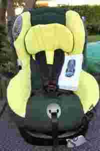 Fotelik technicznie sprawny, bezpieczny do dalszego użytkowania. Fotelik ma nową tapicerkę uszytą na wzór oryginału idealnie spasowaną w kolorze oliwka-kanarek, można ją zdjąć do prania. Styropian pęknięty został sklejony odpowiednim klejem.