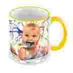 Ceramiczny kubek klasy A+ o pojemności ok. 330 ml z żółtym, lakierowanym uszkiem, z nadrukiem wykonanym według Twojego projektu.