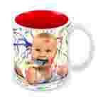 Ceramiczny kubek klasy A+ o pojemności ok. 330 ml z czerwonym, lakierowanym wnętrzem, z nadrukiem wykonanym według Twojego projektu.