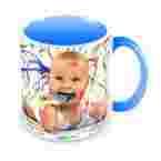 Ceramiczny kubek FUNNY klasy A+ o pojemności ok. 330 ml z wnętrzem i uszkiem w kolorze błękitnym oraz nadrukiem wykonanym według Twojego projektu.