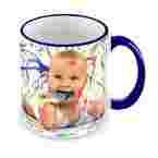 Ceramiczny kubek klasy A+ o pojemności ok. 330 ml z granatowym, lakierowanym uszkiem, z nadrukiem wykonanym według Twojego projektu.