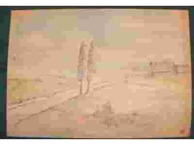 FRANCISZEK RUSZAR RYSUNEK KREDKA WIEJSKI PEJZAŻ