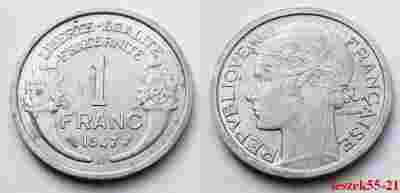 FRANCJA 1 FRANK 1947 B ŁADNA