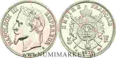 Francja, 5 franków, 1870 rok, A, Ag