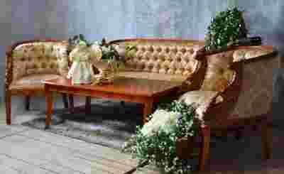 Materiał: drewno mahoniowe ręcznie rzeźbione w kolorze dąb, tapicerka to gruby kremowy jedwab w złotawe ornamenty .