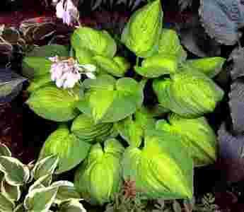 Wolno rosnąca odmiana o dość sporych rozmiarach, osiąga 45-50 cm wysokości i około 90 cm szerokości. Liście duże, żółte otoczone szerokim ciemnozielonym nieregularnym marginesem. Liście utrzymują kolor przez cały sezon. Kwitnie na przełomie lipca i sierpnia. Kwiaty koloru jasno lawendowego.