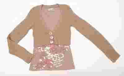 FUNKYDIVA- boski sweterek bluzka 2w1 12-14l, 146-158cm. Sweterek stanowi całość.POd spodem bluzeczka brązowa ze srebrnymi cekinami i aplikacjami. Na wierzchy sweterek - bolerko na trzy guziczki.Jest