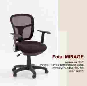 Elegancki i nowoczesny fotel MIRAGE, wyposażony w wygodne siedzisko i oparcie wykonane z tkaniny membranowej oraz siatki..Wyposażony w mechanizm TILT. Fotel dostępny w kolorze czarnym.