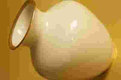 Wykonany jest z porcelany koloru ecru i ozdobiony szerokim złoceniem przy wlewie.