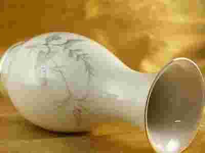 Wyrób z doskonałej jakości porcelany w kolorze ecru o bardzo ładnym fasonie.Jego ozdobą jest subtelny motyw roślinny w ciekawej tonacji barw.Podstawę i górną krawędż wzbogacono złotem,co nadało niezwykłej elegancji.