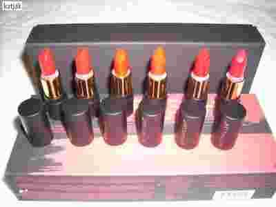 Sztuczne światło na zdjęciu zmieniło kolory, środkowe szminki w rzeczywistości nie są pomarańczowe, lecz po prostu jasno czerwone. Całość jest nieco ciemniejsza niż na zdjęciu.