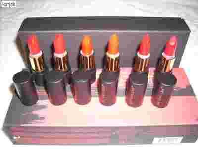 Sztuczne światło na zdjęciu zmieniło kolory, środkowe szminki w rzeczywistości nie są pomarańczowe, lecz po prostu jasno czerwone. Całość jest nieco ciemniejsza niż na zdjęciu.