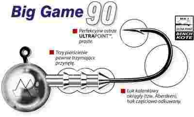 Seria Big Game skonstruowana została w oparciu o specjalnie dla niej zaprojektowane, ekstremalnie mocne haki typu 3 x strong, wykonane z drutu HeavyDUTYŞ, ostrzone w technologii Ultra Point. Każdy hak dla dodatkowego zwiększenia wytrzymałości został silnie spłaszczony bocznie na całym odcinku łuku kolankowego (tzw. forged hook - hak kuty). System talerzowego mocowania przynęty, został specjalnie dla serii Big Game wzmocniony, tak aby w czasie rzutu niezawodnie blokował na haku nawet największych rozmiarów przynęty gumowe. Główki jigowe serii Big Game przeznaczone są do połowu największych ryb drapieżnych, sumów, szczupaków, sandaczy, a także do łowienia wielu gatunków ryb morskich. Ze względu na swoją konstrukcję są praktycznie nieodkształcalne, a przy tym równie ostre i chwytne jak modele wykonane z cieńszego drutu. Nadają się do zbrojenia wszystkich rodzajów miękkich przynęt spinningowych w rozmiarach 7 do 25 centymetrów.