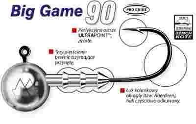 Seria Big Game skonstruowana została w oparciu o specjalnie dla niej zaprojektowane, ekstremalnie mocne haki typu 3X STRONG, wykonane z drutu Heavy- DUTY™, ostrzone w technologii ULTRAPOINT™ i pokrywane policeramiczną powłoką BK1 BenchKote. Każdy hak dla dodatkowego zwiększenia wytrzymałości został silnie spłaszczony bocznie na całym odcinku łuku kolankowego (tzw. forged hook – hak kuty). System talerzowego mocowania przynęty przygotowany specjalnie dla serii Big Game i wzmocniony tak, aby w czasie rzutu niezawodnie blokował na haku nawet największych rozmiarów przynęty gumowe. Główki jigowe serii Big Game przeznaczone są do połowu największych ryb drapieżnych: sumów, szczupaków, sandaczy, a także do łowienia wielu gatunków ryb morskich. Ze względu na swoją konstrukcję są praktycznie nieodkształcalne, a przy tym równie ostre i chwytne jak modele wykonane z cieńszego drutu. Nadają się do zbrojenia wszystkich rodzajów miękkich przynęt spinningowych w rozmiarach 7 do 25 centymetrów.