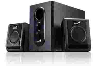 Kompletny zestaw głośników marki Genius, w skład którego wchodzą dwa głośniki satelitarne oraz subwoofer. Specyfikacja techniczna znajduje się w rozwinięciu.