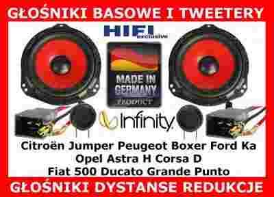 Żeby wymienić fabryczne głośniki trzeba w wielu samochodach oprócz głośników zamontować specjalne mocowania-redukcje-tzw. dystanse. Fabryczne głośniki były dopasowane do mocy fabrycznego radia. Zazwyczaj w starszych samochodach po wymianie fabrycznego radia na nowe mocniejsze zaraz po wymianie psują się głośniki. Zapraszamy na naszej aukcji do zakupu nowych głośników, które mają większą moc niż fabryczne i wytrzymają moc nowego radia. Ponadto zagrają lepszym, niższym basem. Warto dodać, że mają nowoczesną membranę z ciśnieniowo wtryskiwanego polipropyleniu i gumowe zawieszenie, a więc są odporne na warunki atmosferyczne w samochodzie. Bardzo mocny magnes wykonany ze stopu strontium, który wytwarza silne pole magnetyczne w szczelinie cewki głośnika pozwala na uzyskanie dużej efektywności. Dzięki dużej efektywności głośnik gra głośno i niskim basem pod samym radiem. Ponieważ wiele samochodów ma oddzielony głośnik basowy od tweetera, który znajduje się albo w drzwiach (tak jak w Oplu, VW) lub na podszybiu (Peugeot, Renault) oferujemy na naszej aukcji odseparowany system audio. Głośnik basowy tzw. woofer uzupełniliśmy bardzo dobrej jakości głośnikiem wysokotonowym Infinity. Tweeter ma wbudowaną zwrotnicę i wystarczy go połączyć równolegle z głośnikiem basowym, a w praktyce zamienić fabryczny tweeter na nasz. Odseparowany system audio, który oferujemy na tej aukcji bije na głowę głośnik dwudrożny z tweeterem na słupku. Głośnik basowy ma pełną membranę bez wycięcia na tweeter i ma przez to większą powierzchnię, a co za tym idzie więcej basu i gra głośniej niż głośnik współosiowy. Oddzielny tweeter zamontowany na wysokości klamek w drzwiach lub na słupku czy na podszybiu też o wiele lepiej słychać niż pojedynczy głośnik dwudrożny. Dzwięk z tweetera zamontowanego na wysokości ucha kierowcy (a nie kolana czy nogi kierowcy) jest lepiej słyszalny. Całość brzmienia ma lepszą dynamikę i pasmo przenoszenia. Reasumując oferujemy na tej aukcji bardzo fajne głośniki basowe, w komplecie z bardzo dobrymi tweeterami i dokładamy do zestawu plastiki do montażu w fabryczne miejsca samochodu. Całość gra od niskiego basu po wysoki sopran i dużą dynamiką. Głośnik wysokotonowy jest bardzo mały - ponieważ to sam wkład bez obudowy. Ponieważ nie jest obudowany żadnym plastikiem zmieści się w każde miejsce. Można nim zastąpić każdy fabryczny tweeter, lub założyć sobie jako nowe. Tweeter ma z przodu taśmę samoprzylepną - można go przykleić od spodu ramki maskującej głośniki. Proszę się nie sugerować niską ceną. Głośniki nie ustępują jakością podstawowym modelom markowych producentów, a zaoszczędzicie sporo pieniędzy. Proszę pamiętać, że dzisiaj prawie wszystkie głośniki na świecie produkowane są w tym samym miejscu.