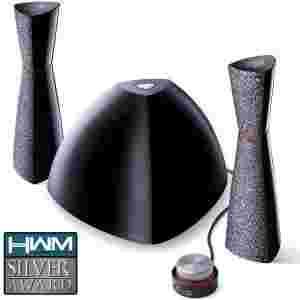 Ten elegancki i oryginalny system audio składa się z subwoofera w kształcie piramidy oraz stylowych, ekranowanych magnetycznie głośników satelitarnych w kształcie klepsydry.